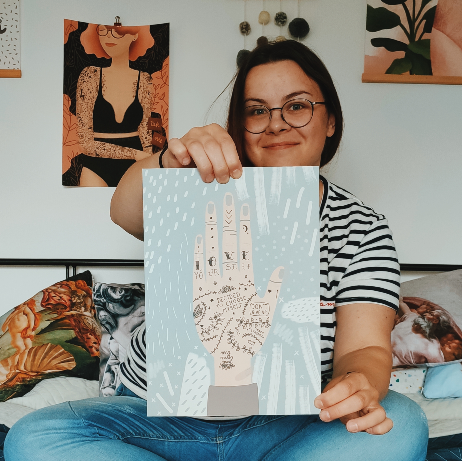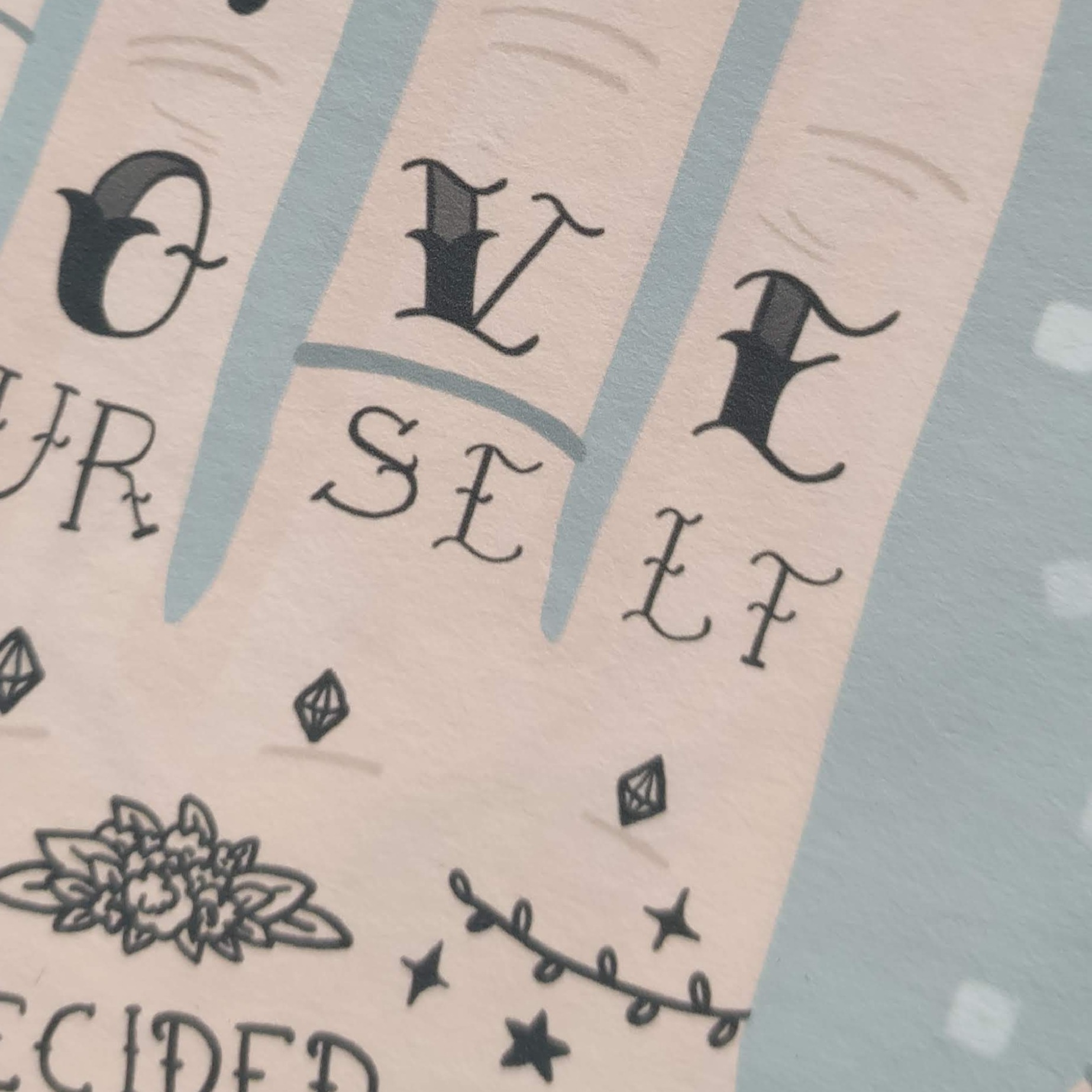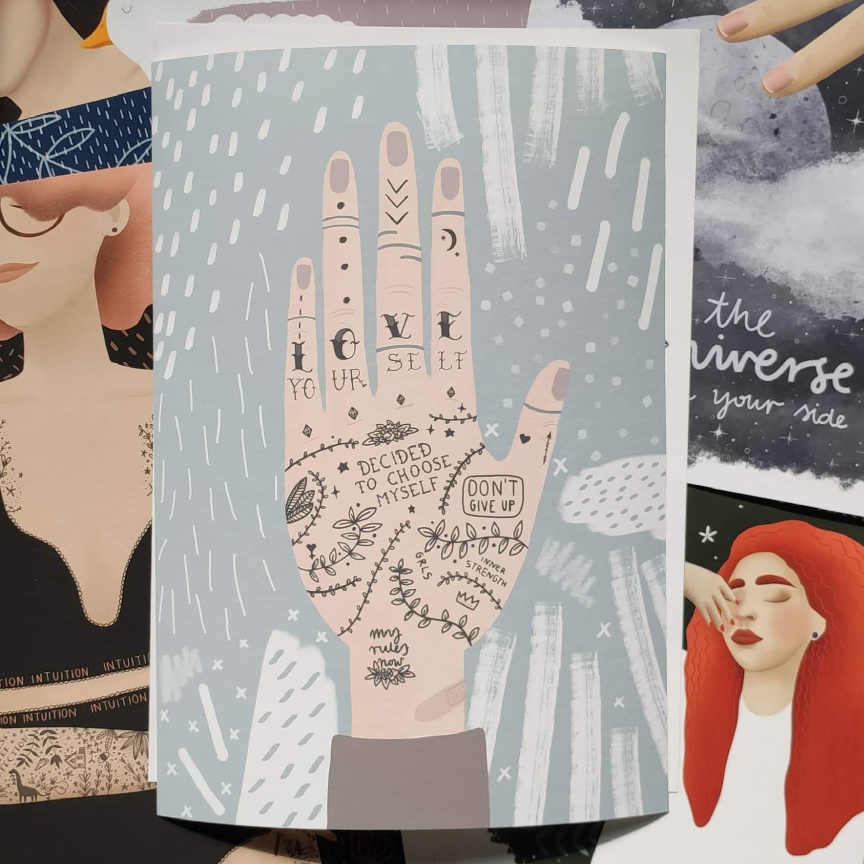 Plakat „Love Yourself”- masz to wypisane na dłoni.